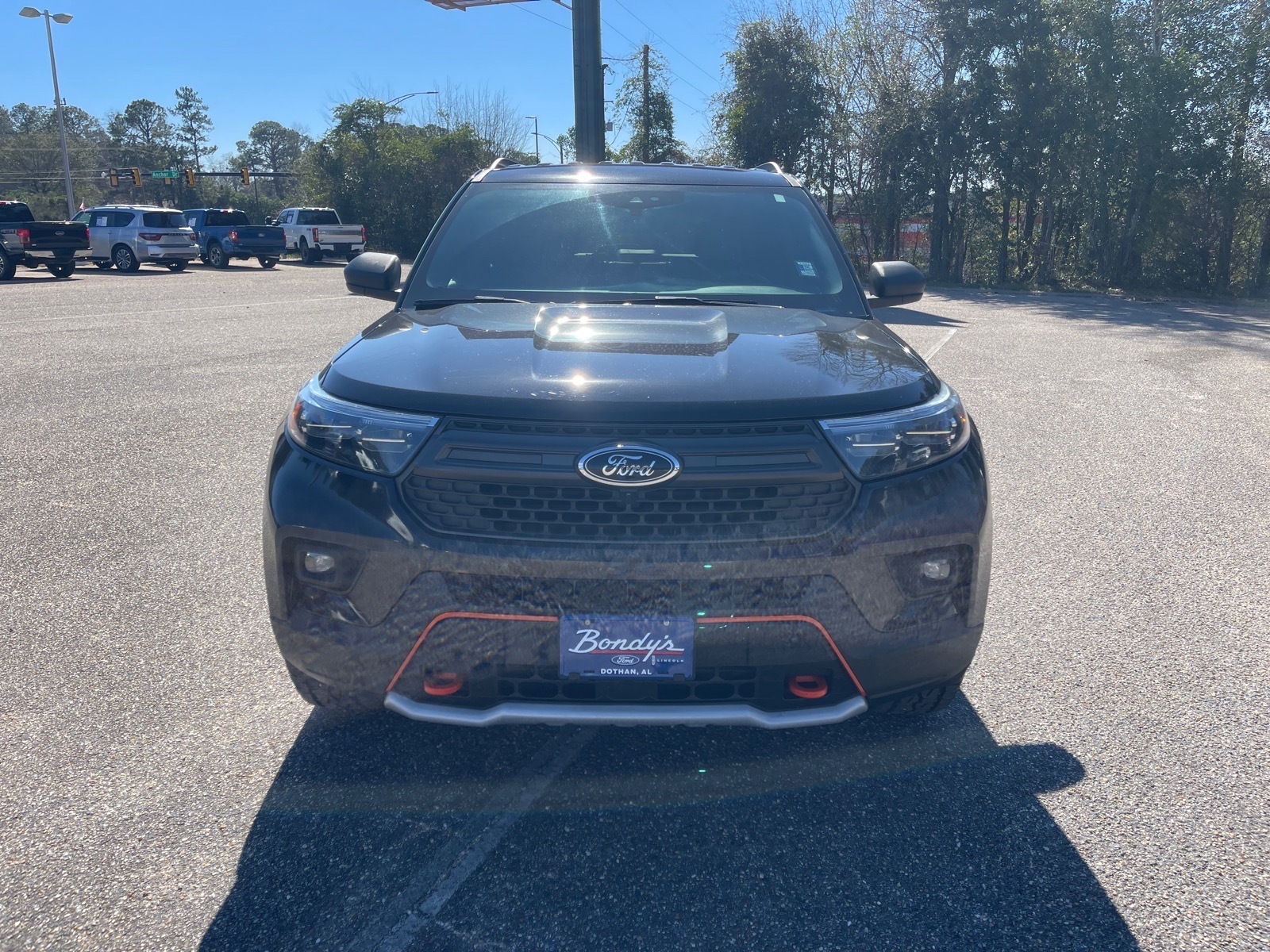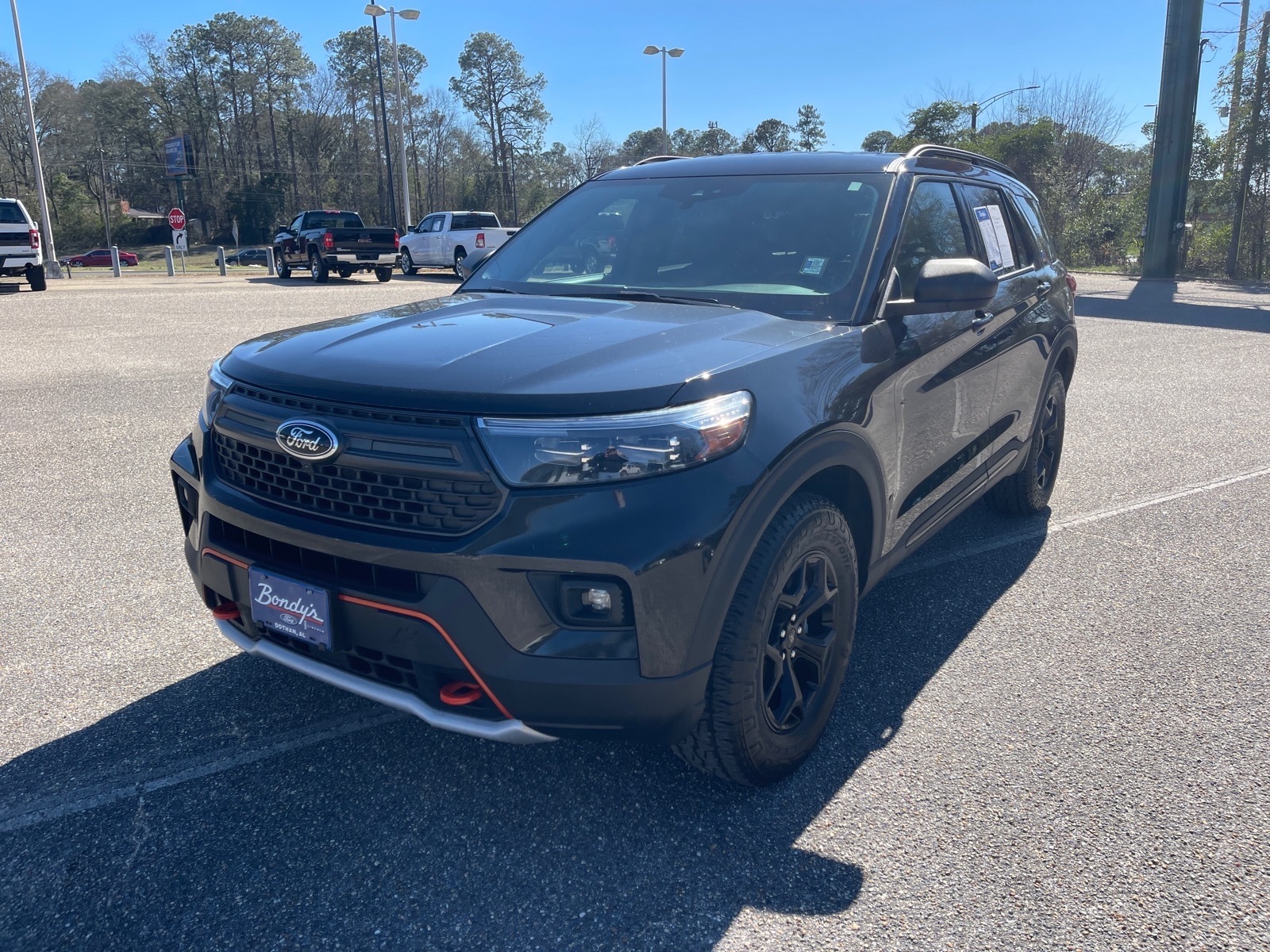CARFAX One-Owner. Clean CARFAX. 2023 Ford Explorer Timberline 4WD, 3.58 Torsen Limited Slip Rear Axle, 3rd row seats: bench, 4-Wheel Disc Brakes, 4G LTE Wi-Fi Hotspot Credit, 6 Speakers, ABS brakes, Air Conditioning, Alloy wheels, AM/FM radio: SiriusXM, AM/FM Stereo, Auto High-beam Headlights, Automatic temperature control, Brake assist, Bumpers: body-color, Compass, Delay-off headlights, Driver door bin, Driver vanity mirror, Dual front impact airbags, Dual front side impact airbags, Electronic Stability Control, Emergency communication system: SYNC 3 911 Assist, Equipment Group 800A, Exterior Parking Camera Rear, FordPass Connect, Four wheel independent suspension, Front anti-roll bar, Front Bucket Seats, Front Center Armrest, Front dual zone A/C, Front fog lights, Front reading lights, Fully automatic headlights, Heated ActiveX Trimmed Captains Chairs, Heated door mirrors, Heated front seats, Heated rear seats, Heated steering wheel, Illuminated entry, Knee airbag, Leather steering wheel, Low tire pressure warning, Navigation System, Occupant sensing airbag, Outside temperature display, Overhead airbag, Overhead console, Panic alarm, Passenger door bin, Passenger vanity mirror, Power door mirrors, Power driver seat, Power Liftgate, Power passenger seat, Power steering, Power windows, Rear air conditioning, Rear anti-roll bar, Rear reading lights, Rear window defroster, Rear window wiper, Remote keyless entry, Roof rack: rails only, Security system, SelectShift Capability w/Paddle Shifters, Speed control, Speed-sensing steering, Speed-Sensitive Wipers, Split folding rear seat, Spoiler, Sport steering wheel, Steering wheel mounted audio controls, SYNC 3 Communications & Entertainment System, SYNC 3/Apple CarPlay/Android Auto, Tachometer, Telescoping steering wheel, Tilt steering wheel, Traction control, Trip computer, Variably intermittent wipers, Voice-Activated Touchscreen Navigation System, Wheels: 18High Gloss Black-Painted Aluminum, 4WD. Agate Black Metallic 4WD 2.3L EcoBoost I-4 10-Speed Automatic THIS VEHICLE IS LOCATED AT BONDYS FORD LINCOLN AT 3615 ROSS CLARK CIRCLE DOTHAN, AL 36303. PLEASE CALL US AT 800-239-5171 TO ASK US ANY QUESTIONS! MON-FRI SALES IS HERE FROM 8:30 TO 7:00 AND SAT 8:30 TO 6:00. WE ARE CLOSED ON SUNDAYS. Call Toll Free 800-239-5171 or 334-792-5171.