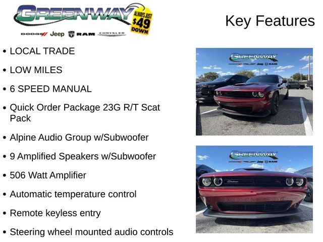 - Local trade with low miles- 6-speed manual transmission- Alpine Audio Group with 506-watt amplifier, 9 amplified speakers, and surround sound- Quick Order Package 23G R/T Scat PackBeneath the muscular hood, the SRT HEMI 6.4L V8 engine delivers an exhilarating 485 horsepower and 475 lb-ft of torque, channeled through a robust rear-wheel-drive system. With a top speed of 182 mph and a 0-60 mph time of just 4.2 seconds, this Challenger is a true performance powerhouse.The exterior of this R/T Scat Pack is finished in a bold and captivating Red color, complemented by 20-inch Lo Gloss Granite Crystal wheels that give it an aggressive, yet refined, appearance. The integrated rear spoiler and dual exhaust tips add to the Challenger's distinctive and sporty styling.Step inside, and you'll be greeted by a host of premium features, including a Uconnect 4C infotainment system with an 8.4-inch display, Apple CarPlay, Android Auto, and a premium Alpine audio system. The Scat Pack logo Houndstooth seats provide exceptional comfort and support, while the heated steering wheel and heated front seats ensure you stay cozy in any weather.Safety is also a top priority, with features like a ParkView Rear Back-Up Camera, Adaptive Cruise Control, and a full suite of airbags to keep you and your passengers secure.This 2021 Dodge Challenger R/T Scat Pack is a true performance icon, blending classic muscle car styling with modern technology and amenities. Don't miss your chance to experience the thrill of the open road in this exceptional vehicle. Schedule a test drive today and discover the power and passion that make the Challenger a true American legend.