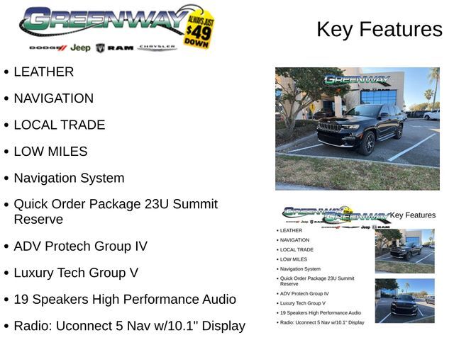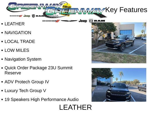 - Leather- Navigation- Local Trade- Low Miles- Quick Order Package 23U Summit Reserve- ADV PROTECH GROUP IV- LUXURY TECH GROUP VThe 2024 Jeep Grand Cherokee Summit is a true testament to Jeep's commitment to exceptional craftsmanship. Boasting a stunning Palermo Leather interior, the cabin is a sanctuary of comfort and sophistication. Indulge in the convenience of the Wireless Charging Pad, the serenity of the 2nd-Row Manual Window Shades, and the advanced technology of the Uconnect 5 Nav system with a 10.1" display.Elevate your driving experience with the Summit Reserve's premium features, including a Heads-Up Display, Rearview Autodim Digital Display Mirror, and Night Vision with Pedestrian-Animal Detection. The 950 Watt Amplifier and 19 Speakers High Performance Audio system will immerse you in a captivating soundscape, while the Ventilated Rear Seats and Deluxe Headliner provide unparalleled comfort.Designed to exceed your expectations, the 2024 Jeep Grand Cherokee Summit is a true masterpiece of engineering and craftsmanship. Experience the pinnacle of luxury and capability by scheduling a test drive at our showroom today. We're confident that this exceptional SUV will exceed your every expectation.Prepare to be captivated by the 2024 Jeep Grand Cherokee Summit – a vehicle that seamlessly blends power, sophistication, and uncompromising attention to detail. Visit us at our showroom to witness its magnificence firsthand and discover the ultimate in automotive excellence.