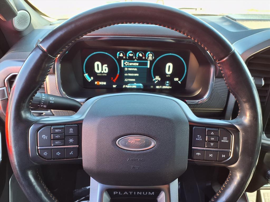 This 2021 Ford F-150 Platinum Supercrew 4x4 is a state-of-the-art motorcar. Boasting a low mileage of 27,573 miles, this vehicle has been meticulously maintained and is sure to turn heads on the road. It is powered by a 3.5 liter 6 cylinder engine with twin turbochargers, and features hill start assist for added safety and control. The exterior is a striking gray metallic while the interior is upholstered in a luxurious black leather. This car has been given a crash test rating of 5 out of 5 stars, ensuring that you can drive with confidence knowing that your safety is paramount.