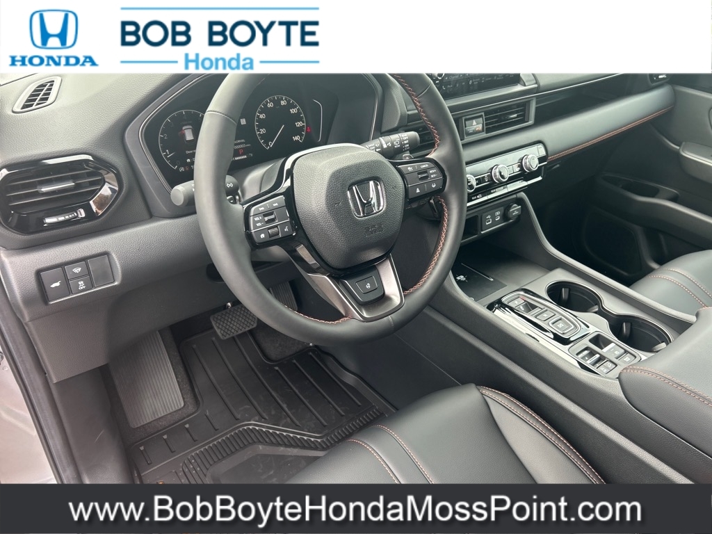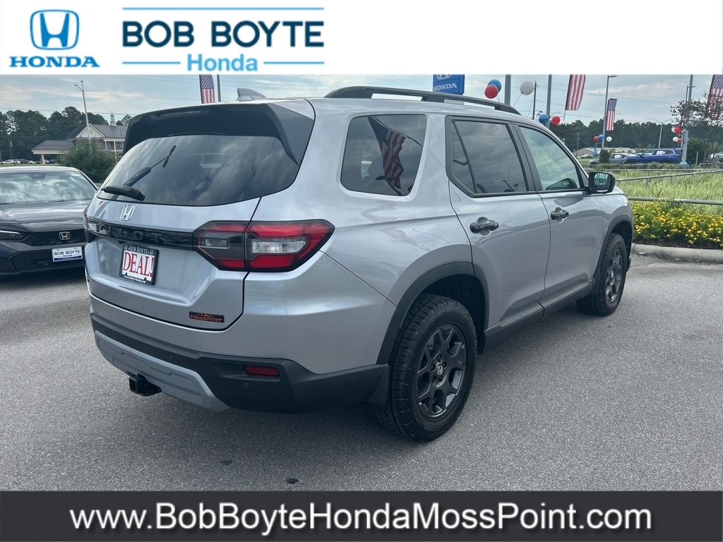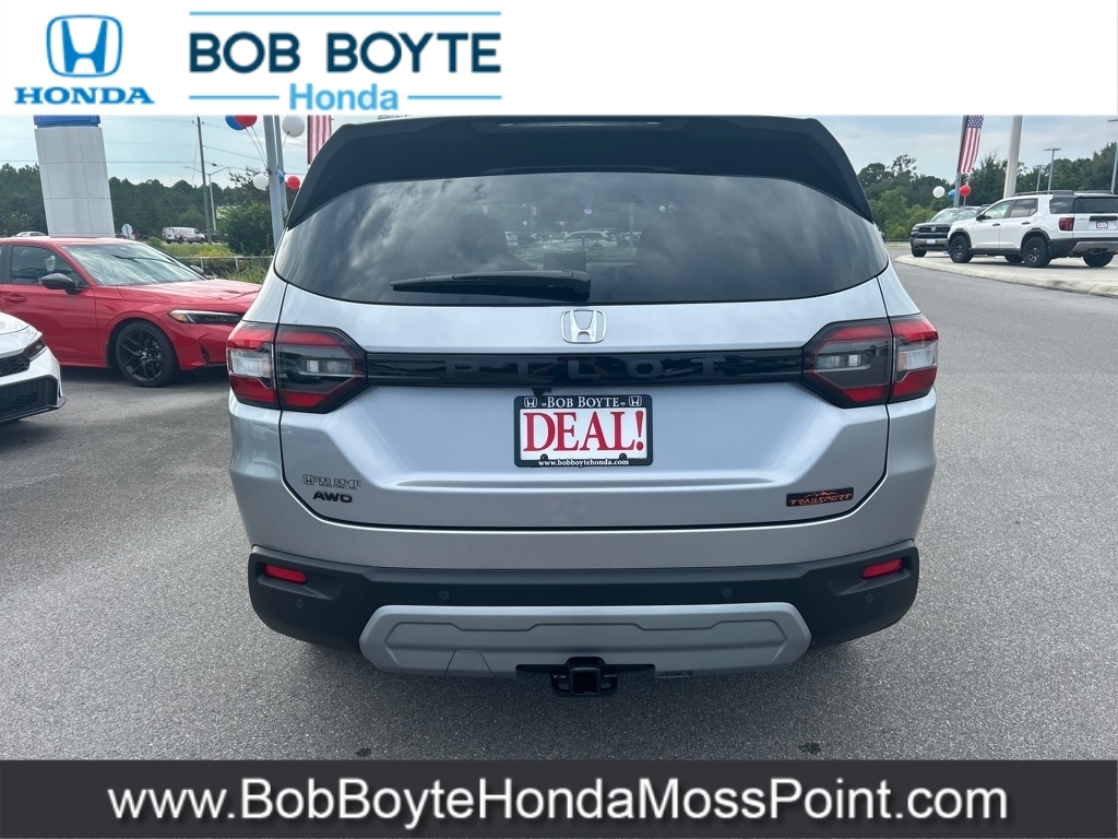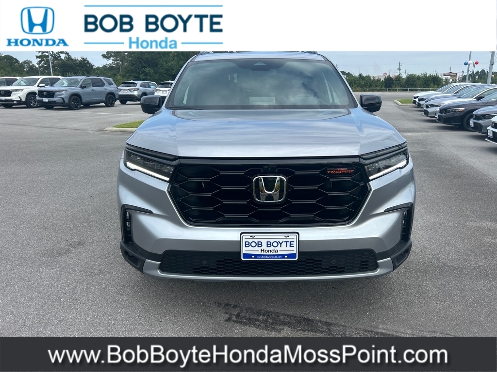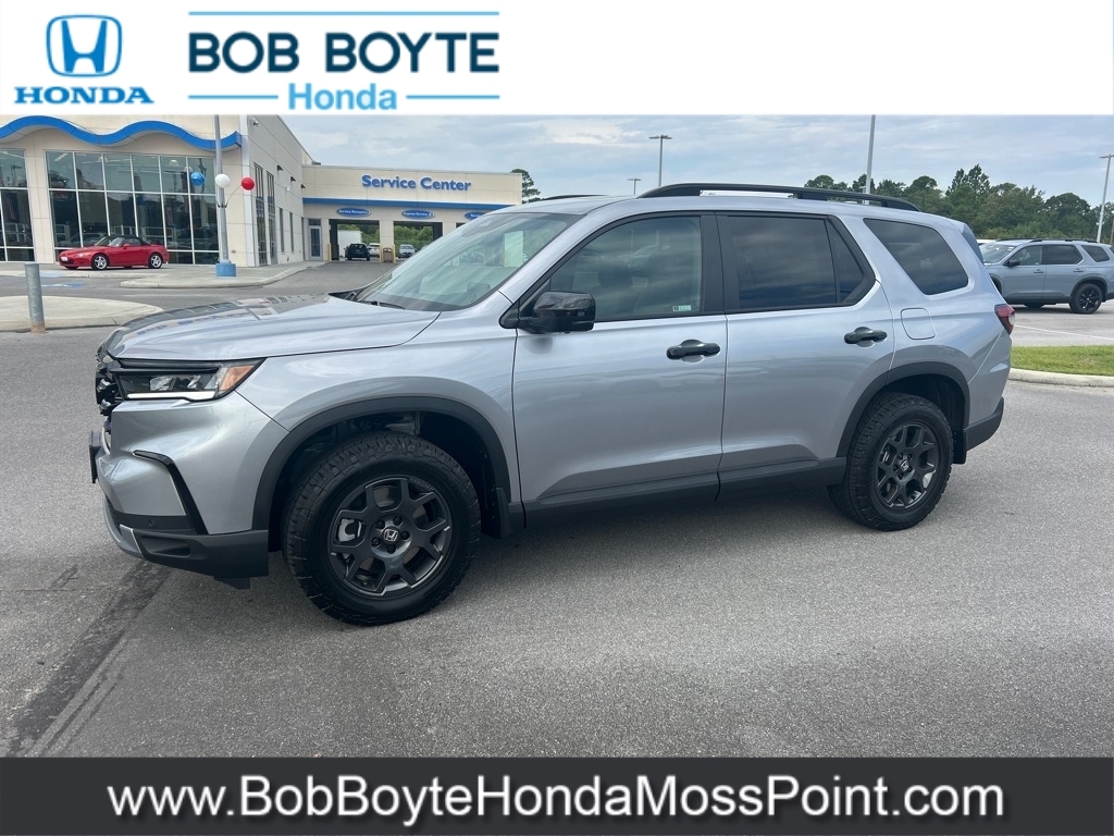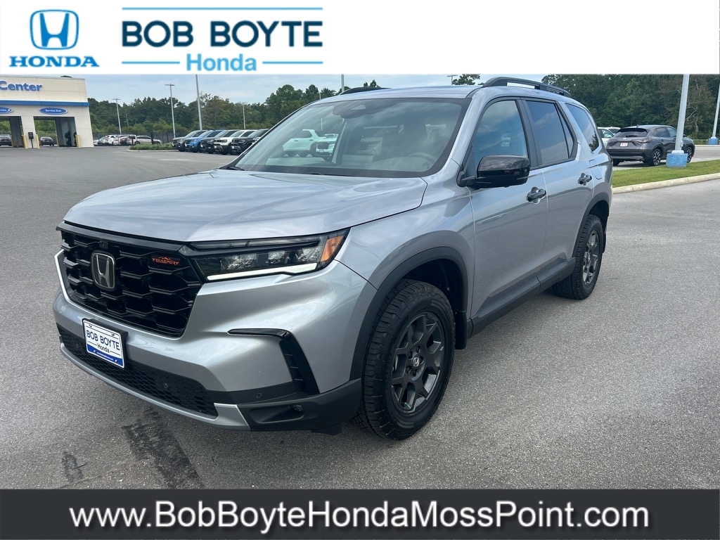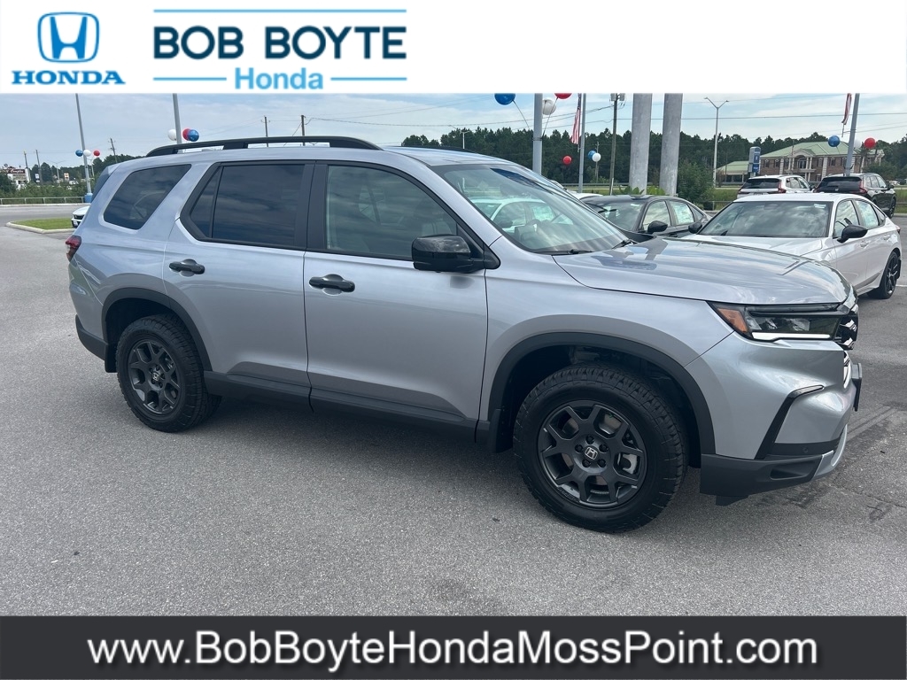 2025 Honda Pilot TrailSport Lunar Silver Metallic AWD 3.5L V6 DOHC 24V 10-Speed Automatic Bring Us All Offers On This Vehicle, New Honda Dealer Serving Gulfport-Biloxi, Alloy Wheels, New Tires, AWD, 9 Speakers, Adaptive Cruise Control: Adaptive Cruise Control (ACC) with Low-Speed Follow, Alloy wheels, AM/FM radio: SiriusXM, Apple CarPlay/Android Auto, Auto High-beam Headlights, Automatic temperature control, Blind Spot Information (BSI) System warning, Brake assist, Delay-off headlights, Dual front impact airbags, Dual front side impact airbags, Durable Synthetic Leather Seat Trim, Electronic Stability Control, Emergency communication system: HondaLink Assist, Exterior Parking Camera Rear, Four wheel independent suspension, Front Bucket Seats, Front dual zone A/C, Front fog lights, Fully automatic headlights, Garage door transmitter: HomeLink, Heated Front Bucket Seats, Heated front seats, Illuminated entry, Knee airbag, Lane departure: Lane Keeping Assist System (LKAS) active, Memory seat, Occupant sensing airbag, Overhead airbag, Panic alarm, Power driver seat, Power Liftgate, Power moonroof, Power passenger seat, Power steering, Power windows, Radio data system, Radio: 245-Watt Audio System, Rear window wiper, Remote keyless entry, Security system, SiriusXM, Speed control, Speed-sensing steering, Speed-Sensitive Wipers, Spoiler, Steering wheel mounted audio controls, Traction control, Variably intermittent wipers, Wheels: 18Shark Gray w/Black Lug Nuts. Bob Boyte Honda Moss Point is a brand new Gulf Coast Honda Dealership serving residents of Biloxi, Gulfport, DIberville, Pascagoula, MS and Mobile, AL. Get a custom no obligation Internet price quote on this vehicle in minutes here: https://www.bobboytehondamosspoint.com/quickquote/index.htm We sell new Honda cars, SUVs, vans and trucks at low prices our Mississippi Gulf Coast customers can afford. Our Honda Auto Finance Staff works with all credit types from good to bad to try to get approved financing. They belie