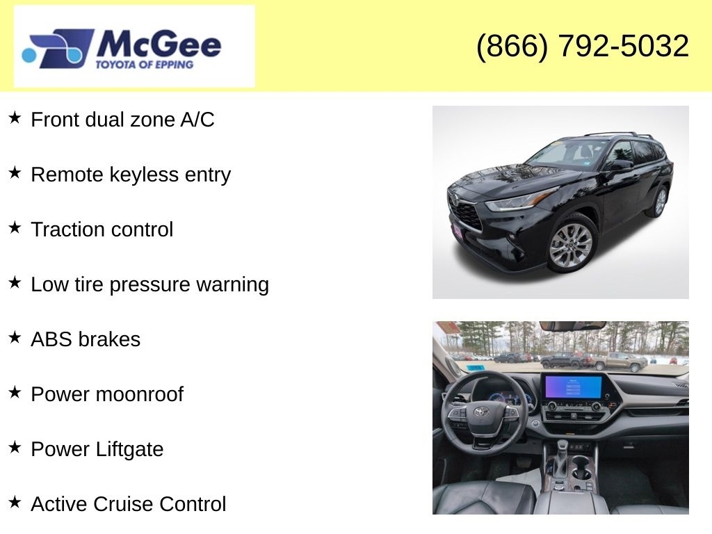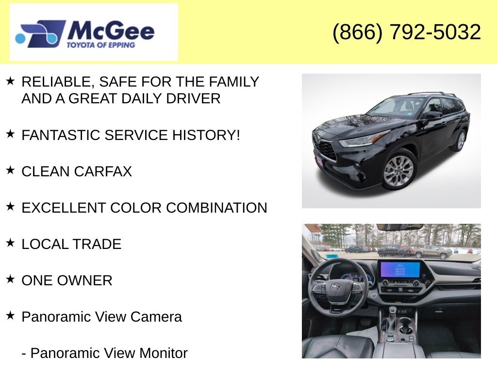 Recent Arrival! RELIABLE, SAFE FOR THE FAMILY AND A GREAT DAILY DRIVER, FANTASTIC SERVICE HISTORY!, CLEAN CARFAX, EXCELLENT COLOR COMBINATION, LOCAL TRADE, ONE OWNER, AWD, ABS brakes, Active Cruise Control, Alloy wheels, Front dual zone A/C, Heated door mirrors, Heated front seats, Heated steering wheel, Heated/Ventilated Front Bucket Seats, Illuminated entry, Leather Seat Trim, Low tire pressure warning, Navigation System, Panoramic View Camera, Panoramic View Monitor, Power Liftgate, Power moonroof, Power passenger seat, Reclining 3rd row seat, Remote keyless entry, Split folding rear seat, Traction control, Ventilated front seats. At McGee Toyota Of Epping we want you to know that all our vehicles are priced at a competitive value position to the market. We use an independent 3rd party software to research internet listings on all vehicles in the market so we can ensure that our prices are the most competitive out there. We do this simply so people choose us when they start searching for their next car. CARFAX One-Owner. 2023 Toyota Highlander Limited 4D Sport Utility Midnight Black Metallic AWD 8-Speed Automatic 2.4L I4 PDI Turbocharged DOHC 16V LEV3-SULEV30 265hp McGee Toyota is a Family-Owned Business and we enjoy assisting all of our guests buying their next vehicle!