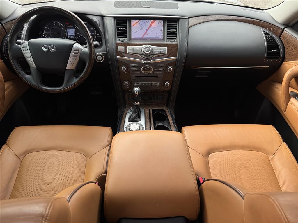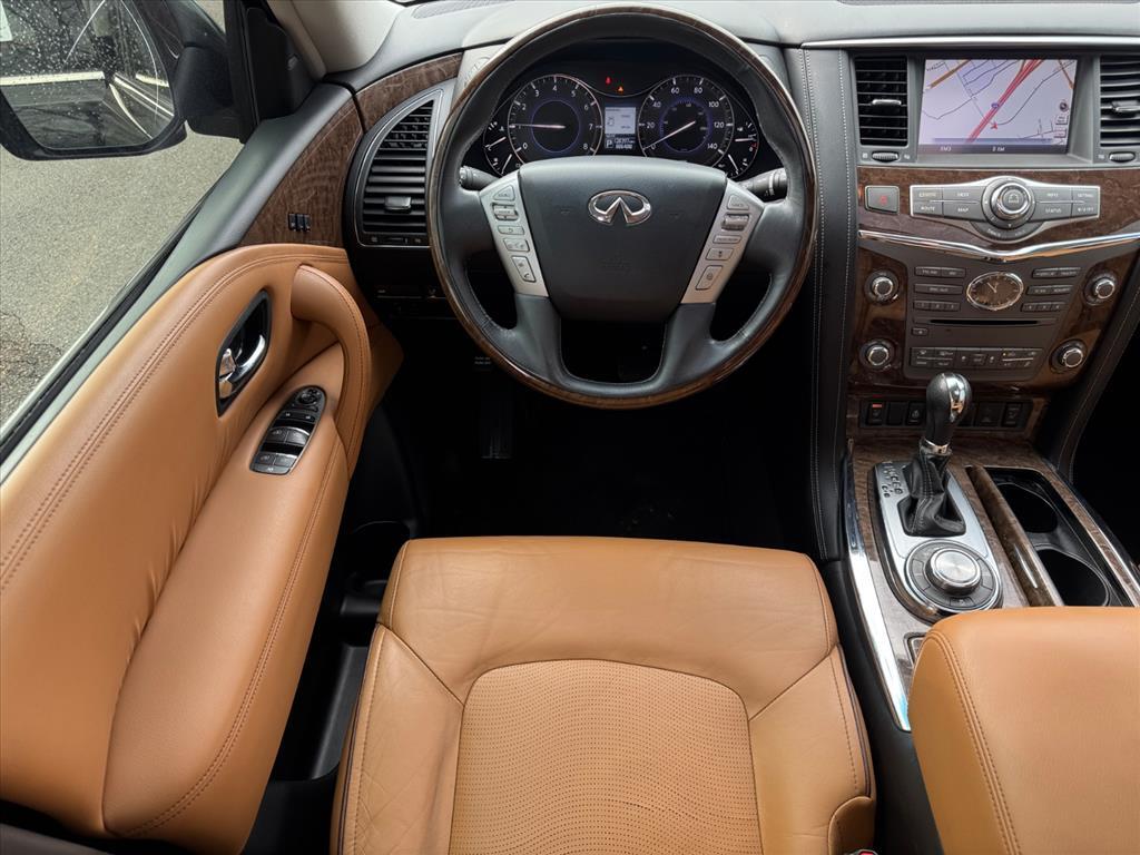 Inside the distinctive QX80 body is an interior long on luxury, including standard Infiniti Hard Drive Navigation System, Around View™ Monitor, Bose® 13-speaker Premium Audio System, available perforated semi-aniline leather seating and an available Tri-Zone Entertainment System with dual seven-inch color monitors, which allows different sources to be played at the same time. The QX80 also offers ample 1st row and class-leading 2nd row roominess.