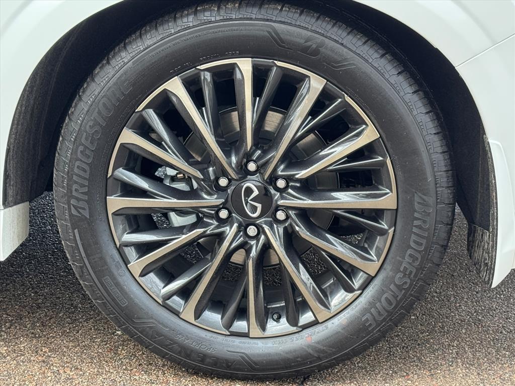 automatic LED headlamps with high beam assist, front LED fog lights, navigation system, Bluetooth hands-free phone system, Around View monitor with front/rear sonar system and moving object detection, rain-sensing variable intermittent windshield wipers, automatic power door locks, remote keyless entry, HomeLink universal transceiver, Infiniti Intelligent Key with illuminated push button ignition, tire pressure monitoring system with individual tire display and full-size spare tire.