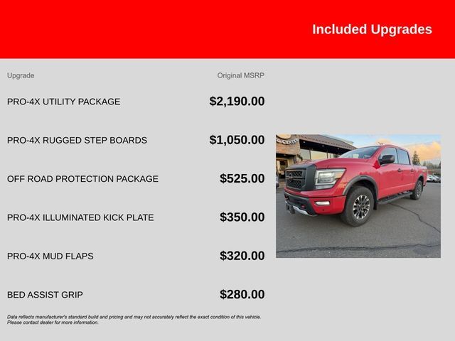Experience the Unparalleled Capability and Versatility of the 2023 Nissan Titan PRO-4XThis 2023 Nissan Titan PRO-4X is a true workhorse, designed to conquer any terrain with its impressive performance and advanced off-road features. Powered by a robust 5.6L V8 DOHC 32V engine delivering 400 horsepower, this Titan is ready to take on your toughest tasks with ease. Paired with a 9-speed automatic transmission and a capable 4WD system, this truck offers exceptional handling and control, whether you're navigating the city streets or tackling rugged off-road trails.• Navigation System/GPS• Spray in Bedliner• Adaptive Cruise• Blindspot Monitor• Smartphone Integration• Backup Camera• Keyless Access w/ Pushbutton Start• Drowsiness Alert• Apple CarPlay/Android Auto• 120V Outlet in Bed• Utilitrack System w/4 Tie-Down Cleats• Power Sliding Rear Window w/Defogger• LED Tailgate Area Illumination• LED Under Rail Bed Lighting• Fender Premium Audio System w/12 SpeakersThe Titan PRO-4X is equipped with a comprehensive Off-Road Protection Package, ensuring you're ready for any adventure. This package includes crew cab interior door scuff protection, an off-road adventure kit, an adventure medic kit, and Pro-4X high-wall floor liners, providing the ultimate in rugged protection.Nissan's commitment to quality and safety is evident in this Titan PRO-4X. With a 167-point inspection, roadside assistance, a transferable warranty, and a comprehensive vehicle history report, you can purchase this vehicle with confidence. The 84-month/100,000-mile limited warranty, 24/7 hour roadside assistance, and 1-year pre-paid maintenance further demonstrate Nissan's dedication to your satisfaction.Don't miss the opportunity to experience the unparalleled capability and versatility of the 2023 Nissan Titan PRO-4X. This truck is ready to take on any challenge, whether you're hauling heavy loads, traversing rugged terrain, or simply enjoying the open road. Contact us today to schedule a test drive and see why the Titan PRO-4X is the ultimate choice for your next adventure.Sales Tax, Title, License Fee, Registration Fee, $250 Dealer Document Fee are additional to the listed price and may be added to the sale price or capitalized cost. All vehicles are subject to prior sale. Please contact the Sales Team to confirm the availability and pricing of all vehicles.